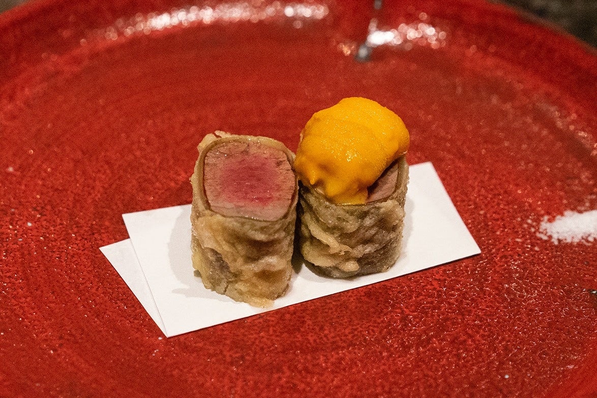 乾燥昆布を⽢酢に浸し、表⾯を刃で薄く削る職⼈による技術が必要な⽩板昆布を佐賀⽜の繊細なヒレ⾁を巻き天麩羅に仕⽴てております。⼀つは塩で、もう⼀つは季節の雲丹と⼀緒にお召し上がり下さい。