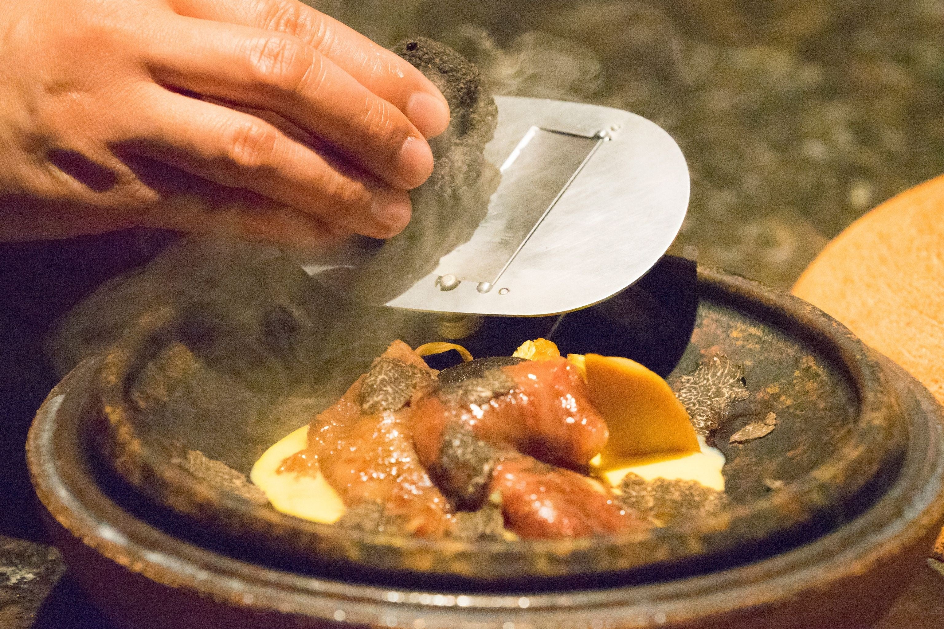 〆のご飯:佐賀⽜サーロインとトリュフのすき焼きと⼟鍋ご飯