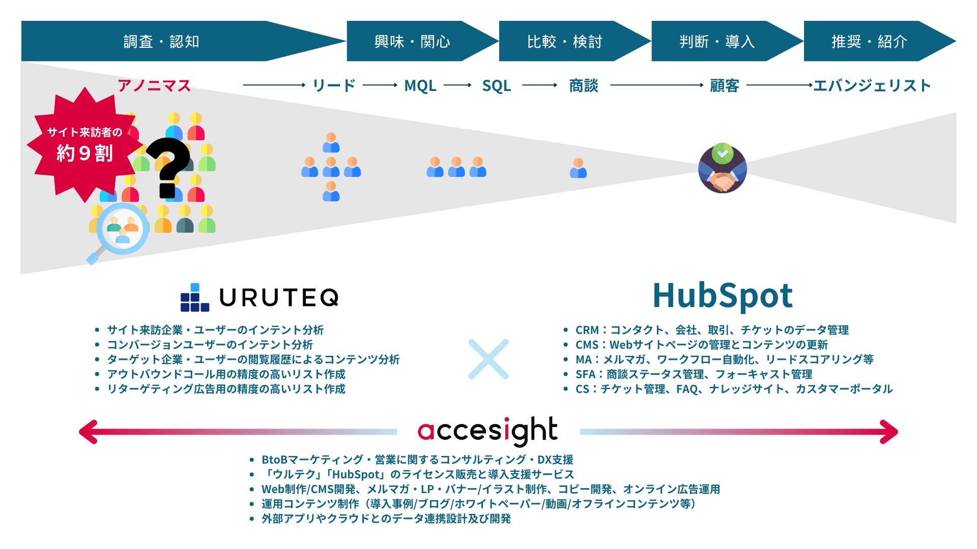 このような背景から、アクセサイトはBtoBマーケティング・営業業務をより最適化するために、ウルテクの販売パートナーおよび導入支援を開始し、さらにこれまで培ったHubSpot導入のノウハウとあわせてアノニマス段階を含めた購買ファネル全体の包括的なサポートを提供します。
