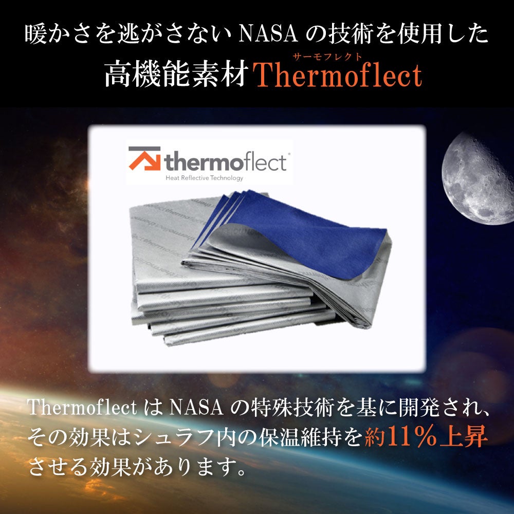 DefenceシリーズにはNASAの元に開発したThermoflectを使用し、最大でシュラフ内の温度を約11%上昇させる効果があります。