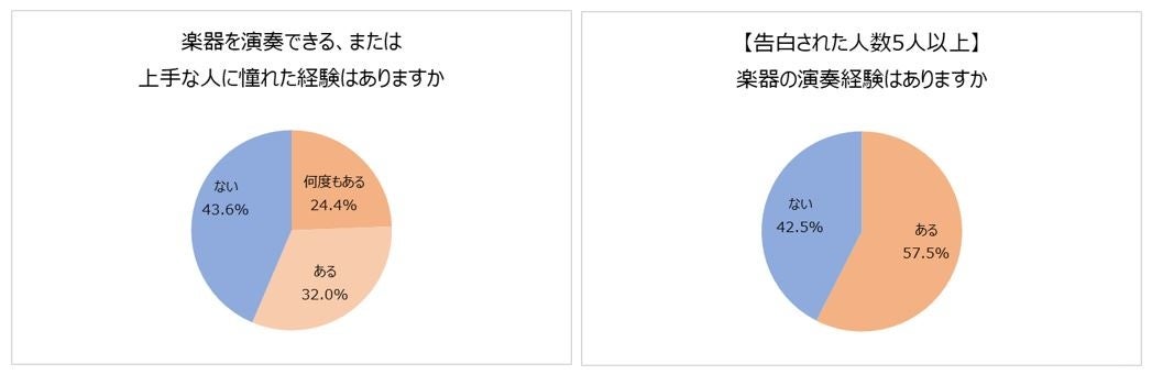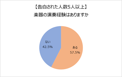 さらに、告白された人数と楽器の演奏経験の有無について見てみると、5人以上から告白された人の57.5%に楽器の演奏経験があることが明らかに。楽器ができる人の方が、いわゆる“モテる”傾向にあると言えそうです。