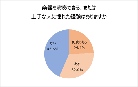 特に好きなミュージシャンがいる人などは、楽器を上手に演奏できる身近な人に憧れを抱いた経験があるのではないでしょうか。楽器を演奏できる、または上手な人に憧れた経験の有無を聞いたところ、「何度もある(24.4%)」と回答したのは約4人に1人。「ある(32.0%)」を合わせると過半数に経験がありました。