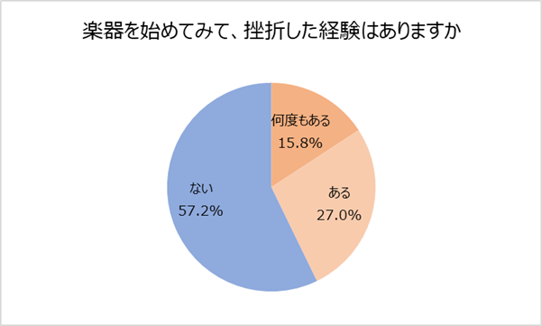 楽器の演奏に関して初めから弾けるという人はめずらしいはず。楽器を始めてみて、挫折した経験の有無を質問しました。結果は「何度もある(15.8%)」と「ある(27.0%)」を合わせて、4割以上の人に挫折経験がありました。働きながら独学で楽器の演奏ができるようになるには、時間だけでなく、根気が必要です。始めるきっかけの一つとして、教室でレッスンを受けることを検討してもいいかもしれません。