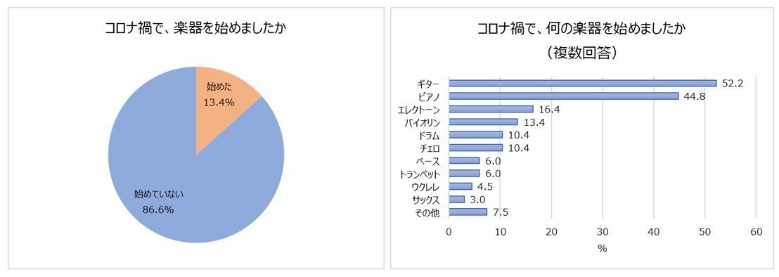 コロナ禍で楽器を始めたか、という質問では、全体の8人に1人以上が「始めた(13.4%)」※と回答。おうち時間が増えたことによって新たに趣味を探した人が多くいると考えられ、その一つとして、楽器の演奏を選択した人が一定数いることが明らかになりました。何の楽器を始めたのか質問したところ、最も多かったのは半数以上が回答した「ギター(52.2%)」でした。続いて、「ピアノ(44.8%)」「エレクトーン(16.4%)」という結果でした。「バイオリン(13.4%)」や「ドラム(10.4%)」、「チェロ(10.4%)」も1割を超えています。