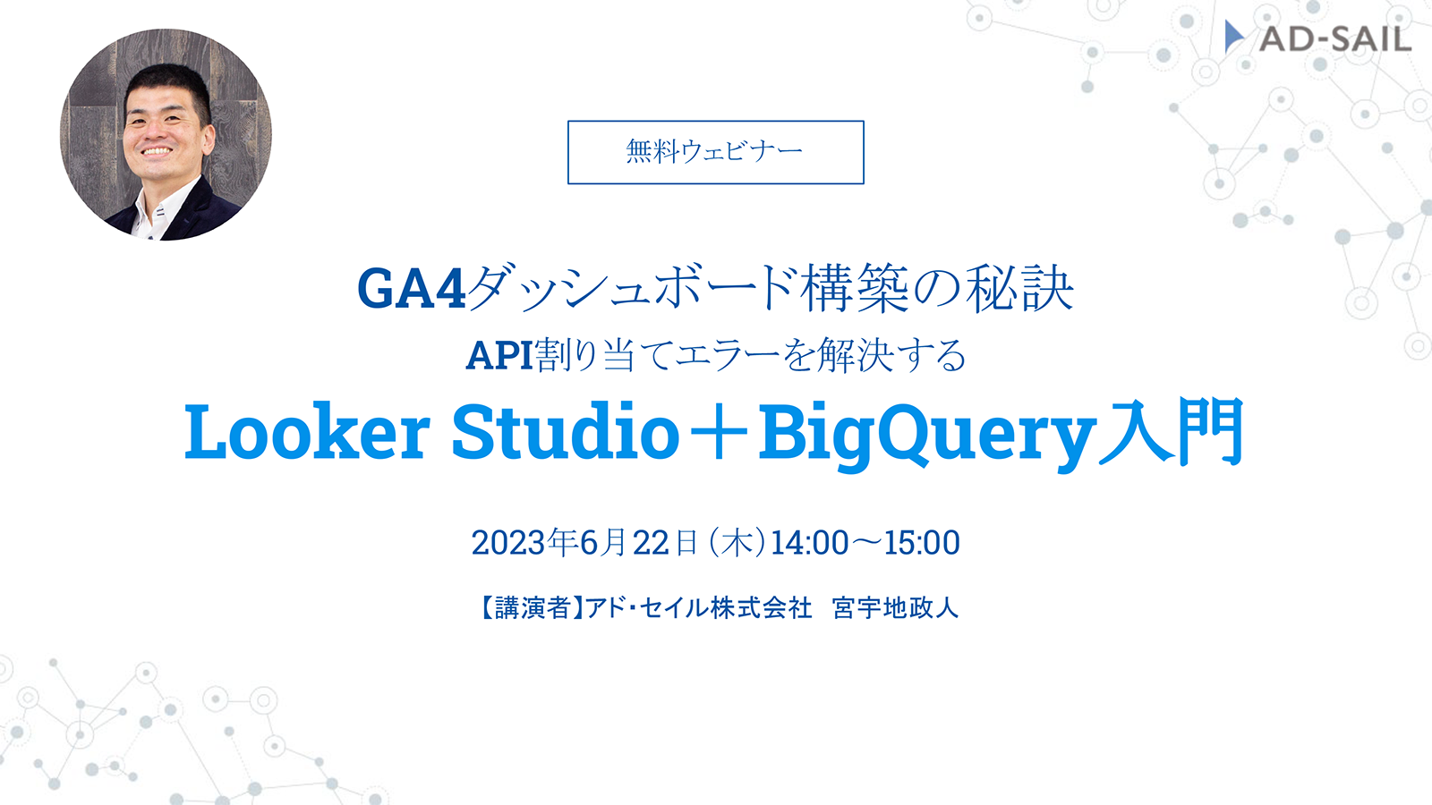 アド・セイル株式会社は6月22日(木)に、Webマーケティングのご担当者やWebディレクター、マーケターなど、Webに携わるお仕事をされている方々を対象に、オンラインセミナー「GA4ダッシュボード構築の秘訣:API割り当てエラーを解決するLooker Studio+BigQuery入門」(無料)を開催いたします。