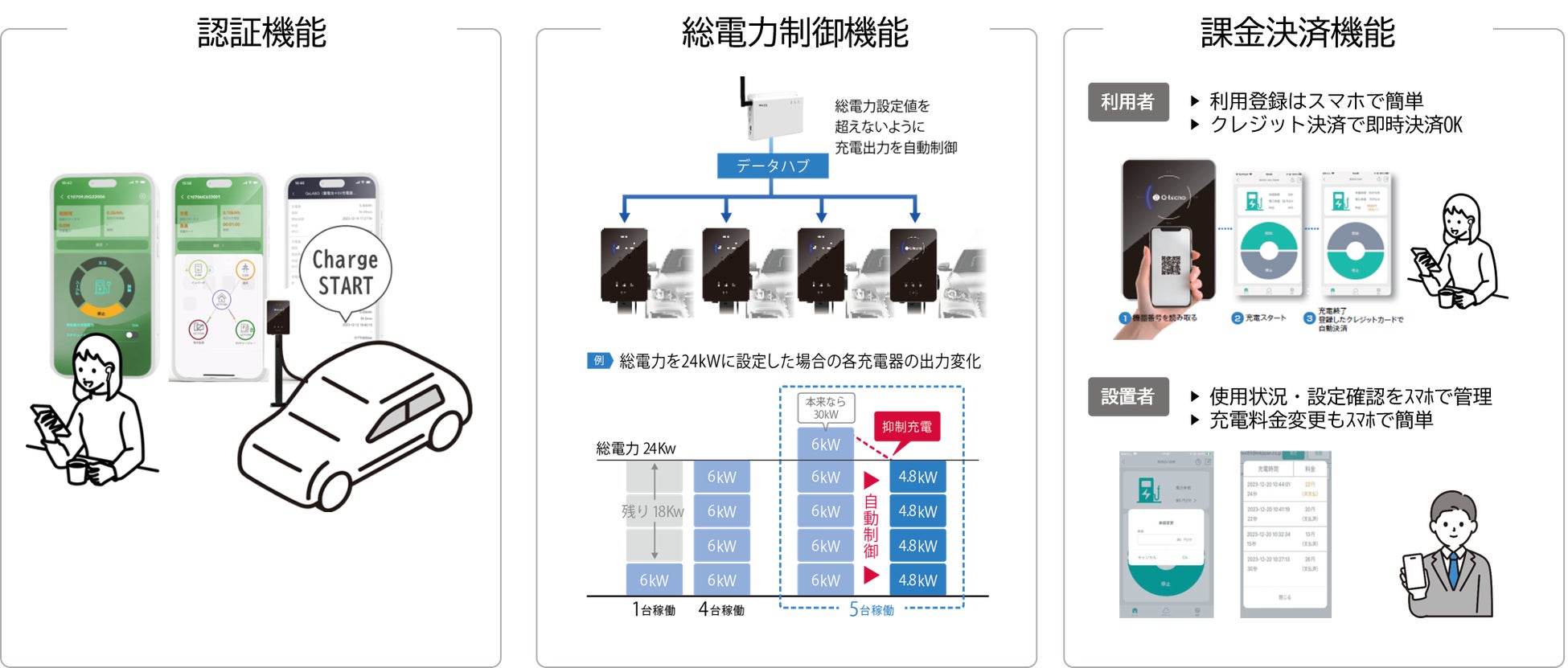 複数台充電時に充電電力を監視し、上限を超えないよう自動で制御。電気設備の増強や、