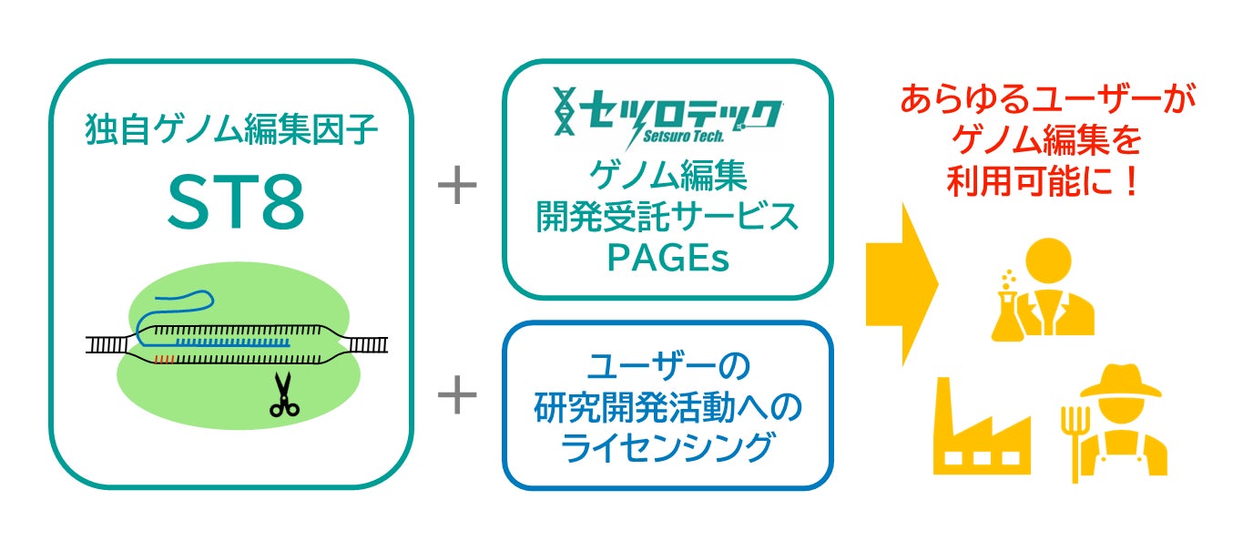 セツロテックでは、ゲノム編集技術を用いた研究開発受託サービス(PAGEs)を提供しています。ユーザーがゲノム編集技術についての知見・ノウハウを保有していない場合でも、セツロテックがゲノム編集による研究開発のサポート体制を提供するとともに、ST8の利用によって事業化へのスムーズな移行をお手伝いします。