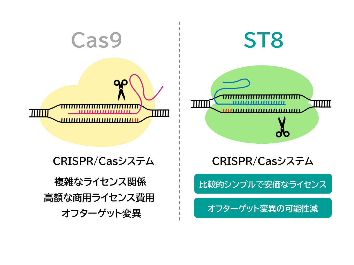 ST8は、CRISPR/Cas9システムが持つ課題(特許紛争・特許費用・オフターゲット変異*)を解決する新規ゲノム編集因子です。ST8は、CRISPR/Casシステムで機能するヌクレアーゼであり、Cas9に代替するゲノム編集因子として利用可能です。セツロテックでは、ST8のライセンシングを開始し、対象生物における評価試験からスタートすることも可能です。