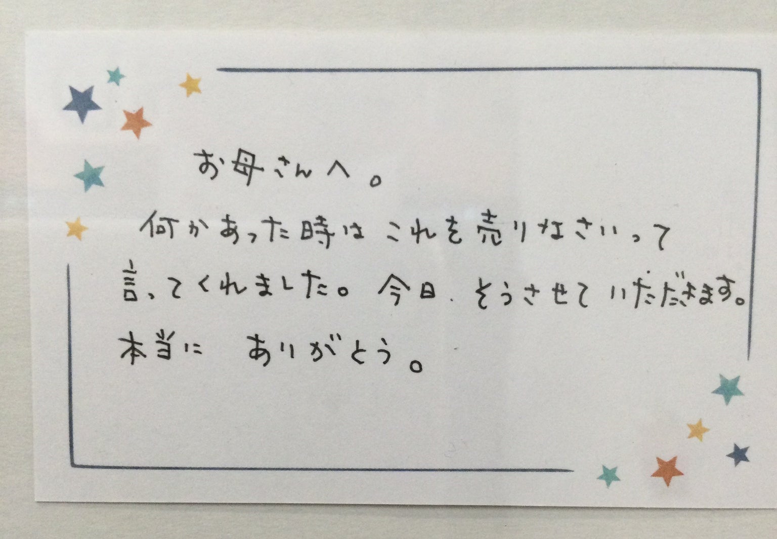 中でも、生前、お母様に、困ったときの生活の足しにと渡してもらったお品物をお買取りさせて頂いた際の、天国のお母様へのラブレターがとても印象深く素敵なエピソードだったので、こちらにて掲載、ご紹介させて頂きます。