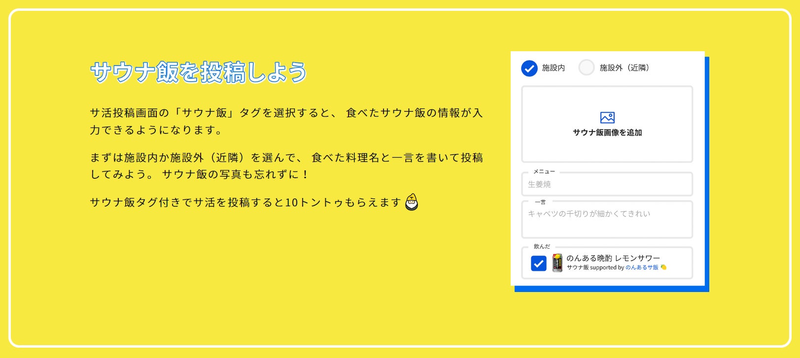 あなたも”サウナ飯”体験を投稿して、一緒に”サウナ飯”を楽しみませんか?