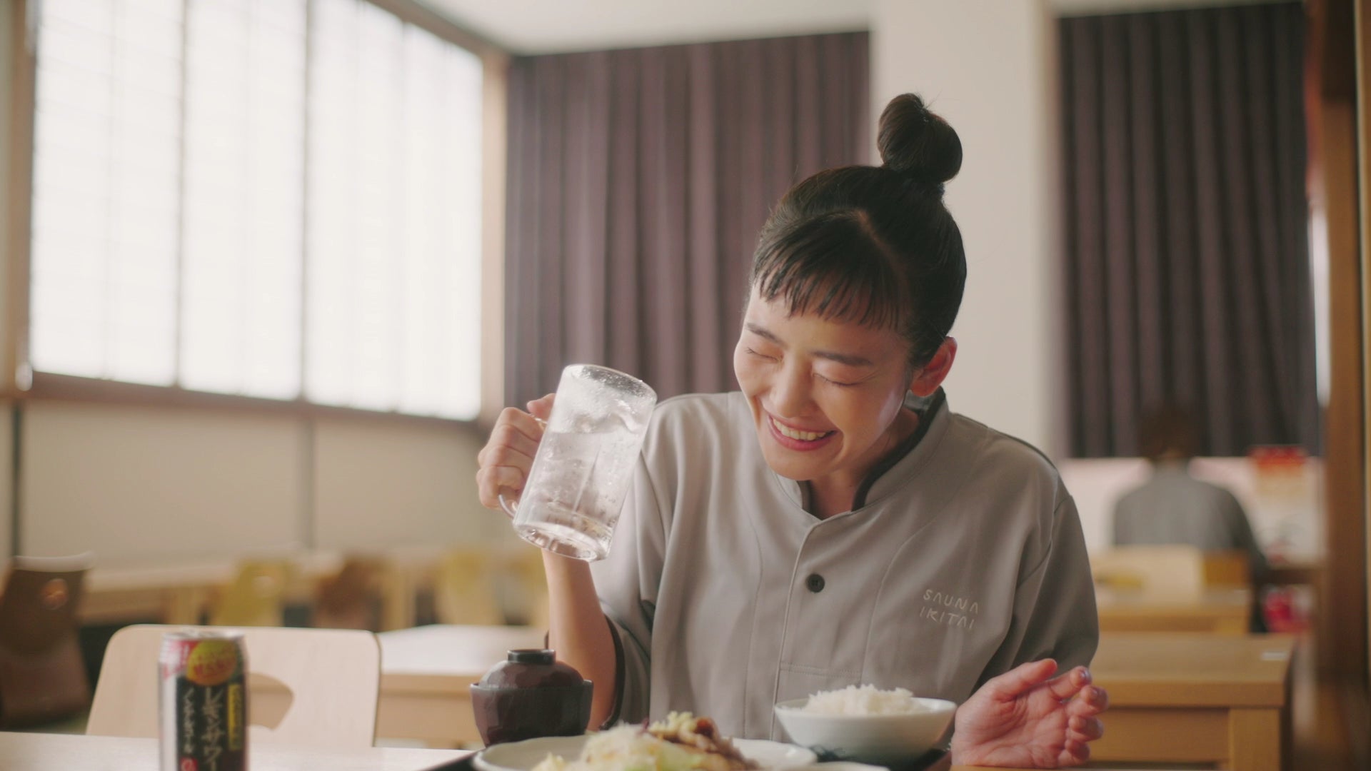 コッテリや濃い味の”サウナ飯”と甘くない「のんある晩酌 レモンサワー ノンアルコール」を楽しみ、スッキリした様子で満面の笑みを浮かべます。