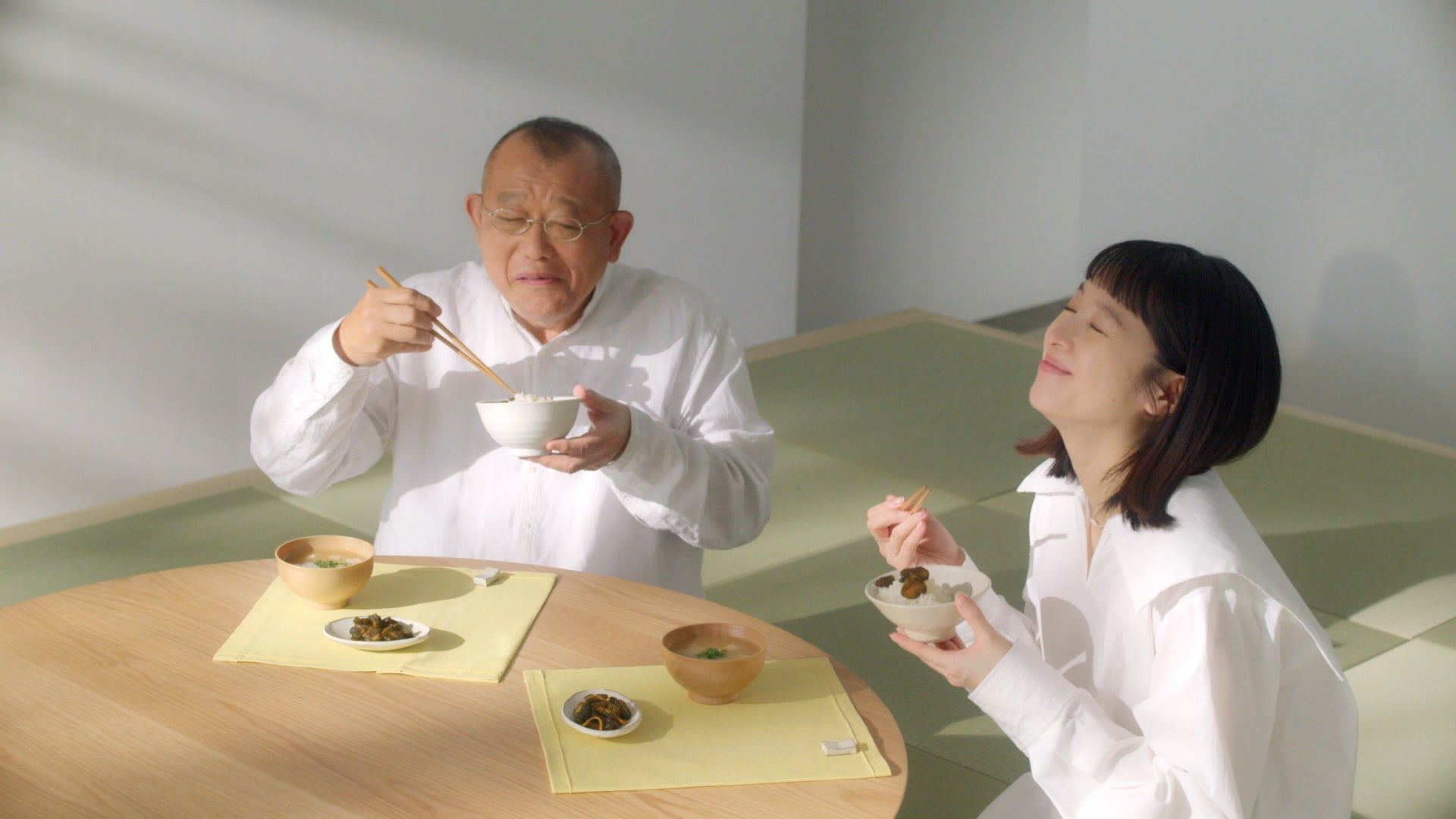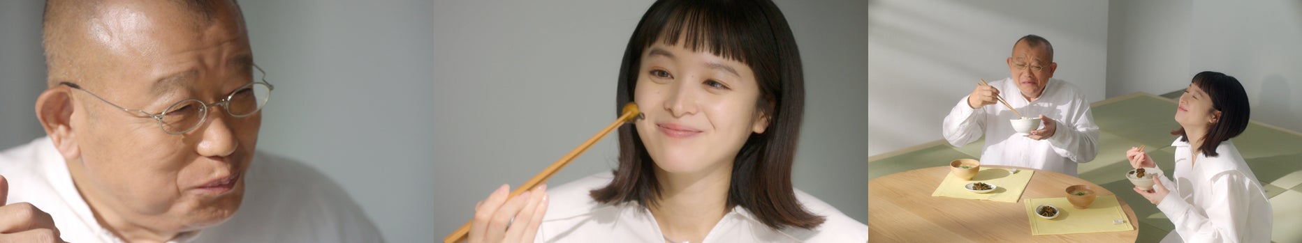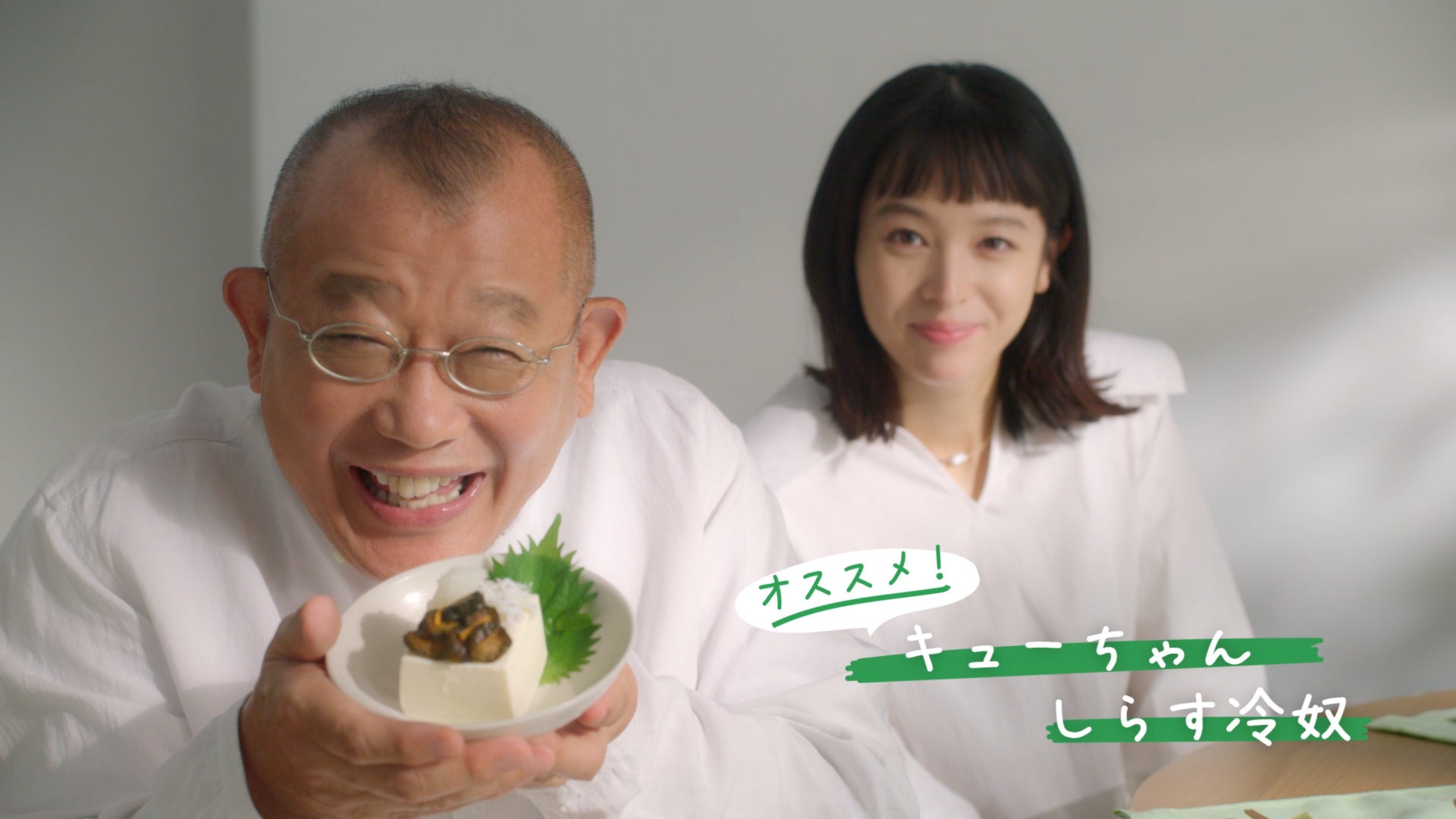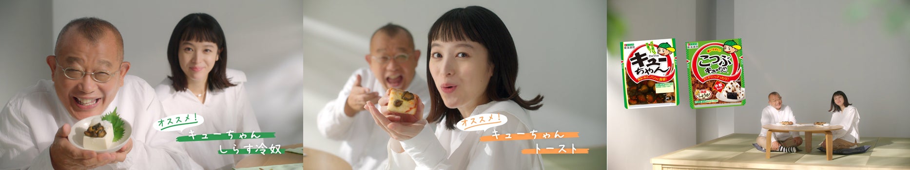 キューちゃん歴51年の笑福亭鶴瓶さんと20年の清野菜名さん。新CM「キューちゃん体験篇 ごまラー油味」では、お2人が幸せそうに「きゅうりのキューちゃん」を頬張り、いくつになってもだれと食べても笑顔になる「きゅうりのキューちゃん」の魅力をお伝えいたします。