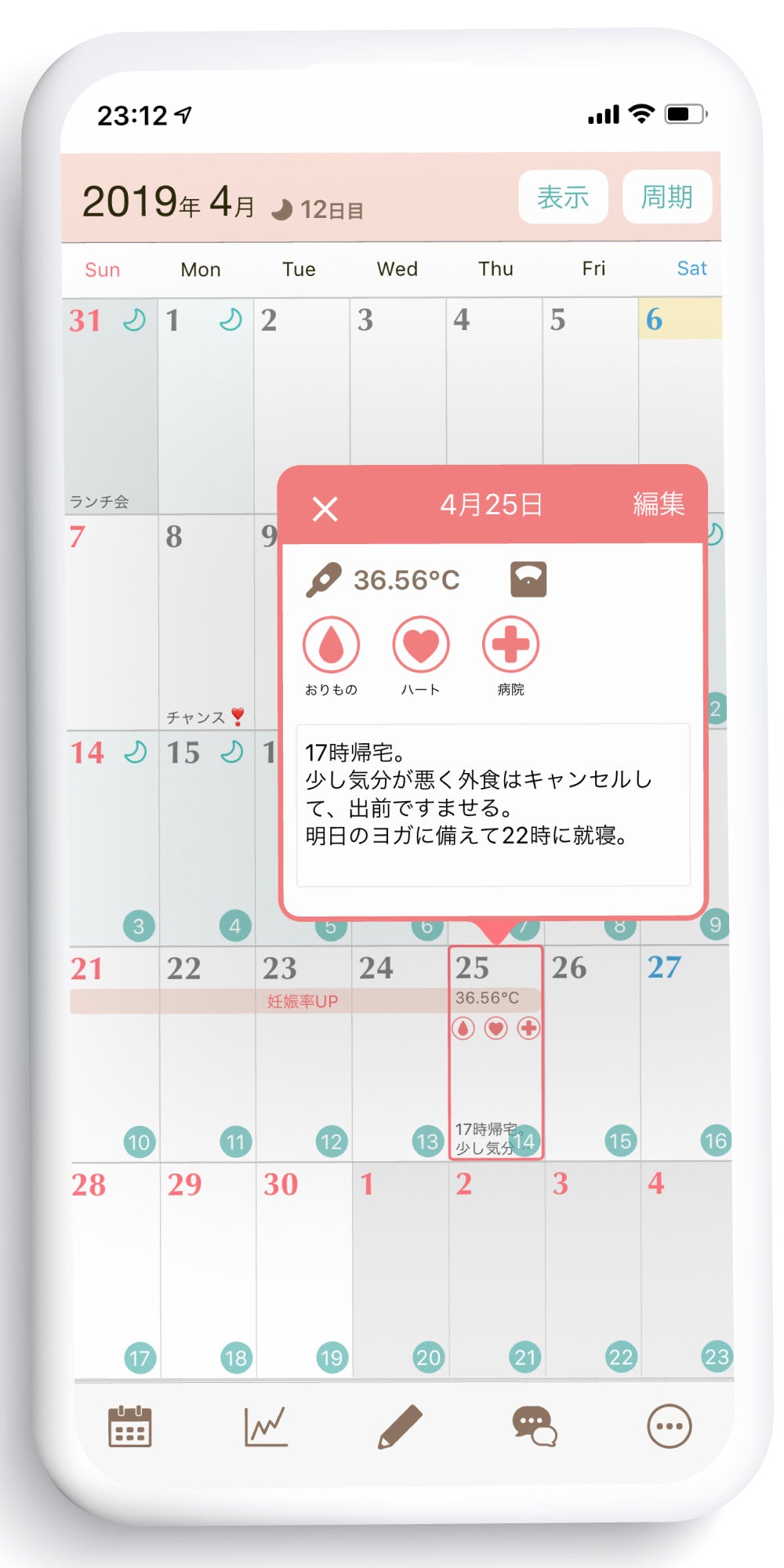 基礎体温だけでなく、体調管理スタンプやメモといった日々の記録は振り返り確認することも重要です。