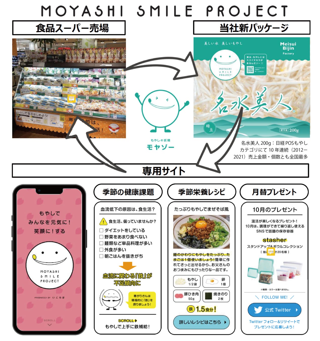 もやしなど食品生産販売の名水美人ファクトリー株式会社(代表取締役社長 奈良 賢吾「以下当社」)は、岡山第1~3工場において生産するもやしのパッケージを一新し、もやしの栄養ブランディングプロジェクト「MOYASHI SMILE PROJECT(以下「MSP」)」を4月12日より開始します。