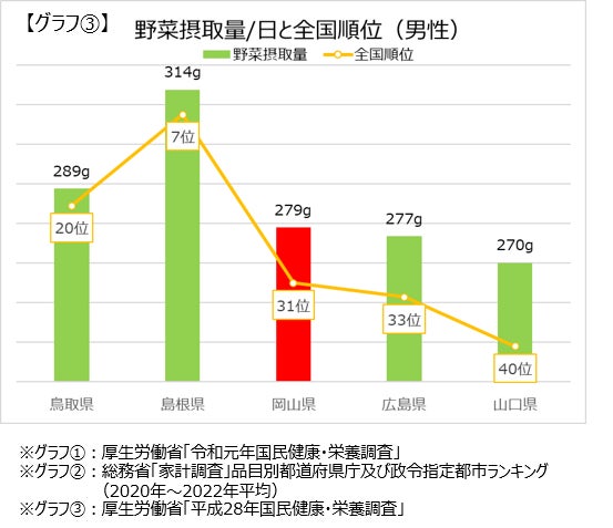 右グラフ③は、平成28年度の同調査による中国地方5県のデータとなりますが、岡山県の男性においては279gと、全国平均の284gを下回る全国31位となっております。