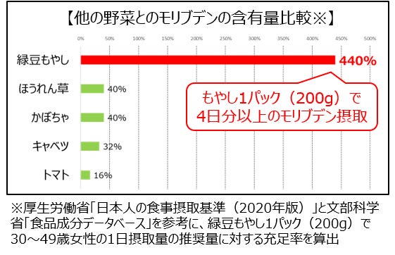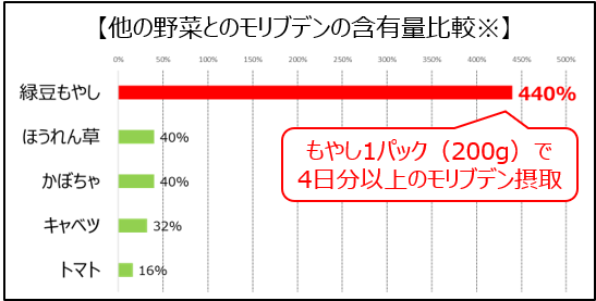 しかし、もやしには、厚生労働省が定めた推奨摂取量の4日分以上の「モリブデン」 (右下グラフ)