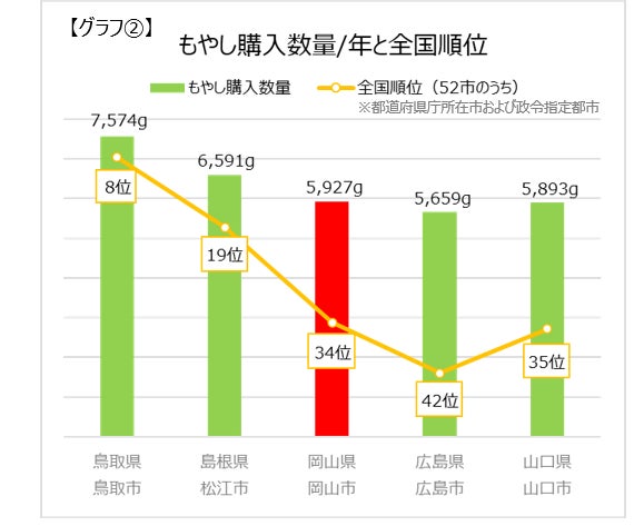 一方で、鉄補給のサポーターであるもやしの年間平均購入数量(右グラフ②)を中国地方の5県庁所在地別で調べたところ、当社拠点である岡山市をはじめ瀬戸内海側が少ないことがわかりました。