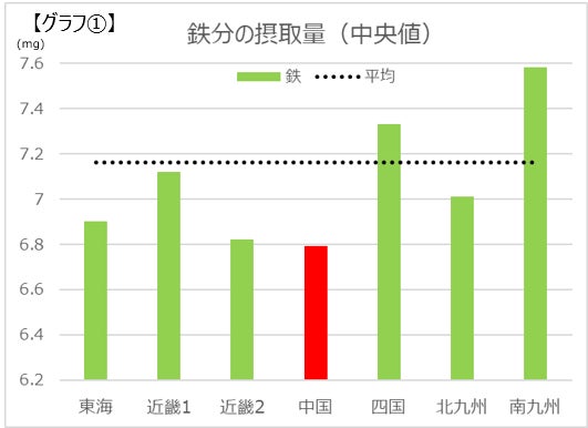 特に、中国ブロック(岡山県、広島県、山口県、鳥取県、島根県)では、鉄分の摂取量が全国に比べ大きく下回っております。(右グラフ①)