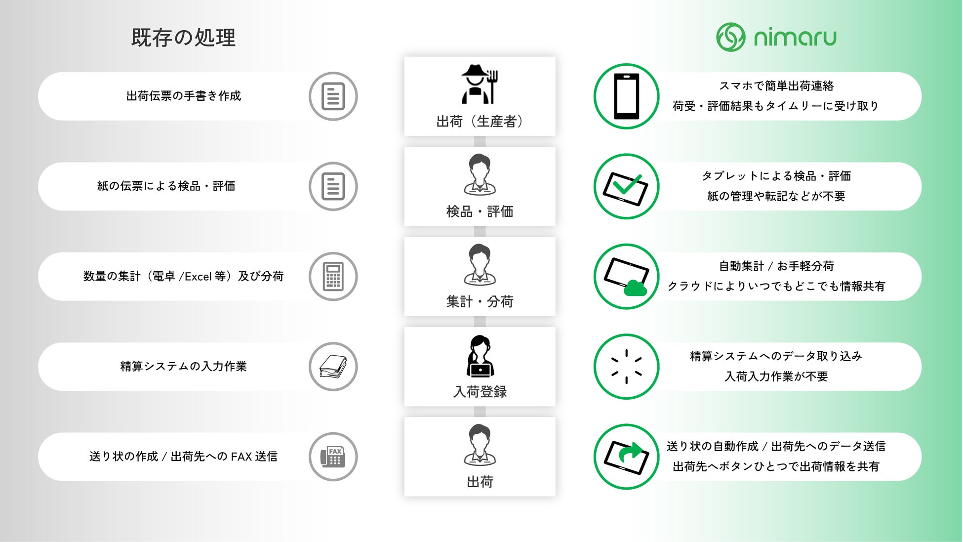 当社は今回の資金調達によって、nimaruの利用顧客拡大のためのセールス・カスタマーサクセス組織強化、及び開発体制の増強による流通現場におけるより幅広い業務へのサービスの対応による顧客価値の拡大を図ります。今後も当社は重要な社会インフラである農業流通分野に特化したプラットフォームの提供により、農産物流通の最適化、現場業務の効率化を実現し、当業界の課題解決に貢献してまいります。