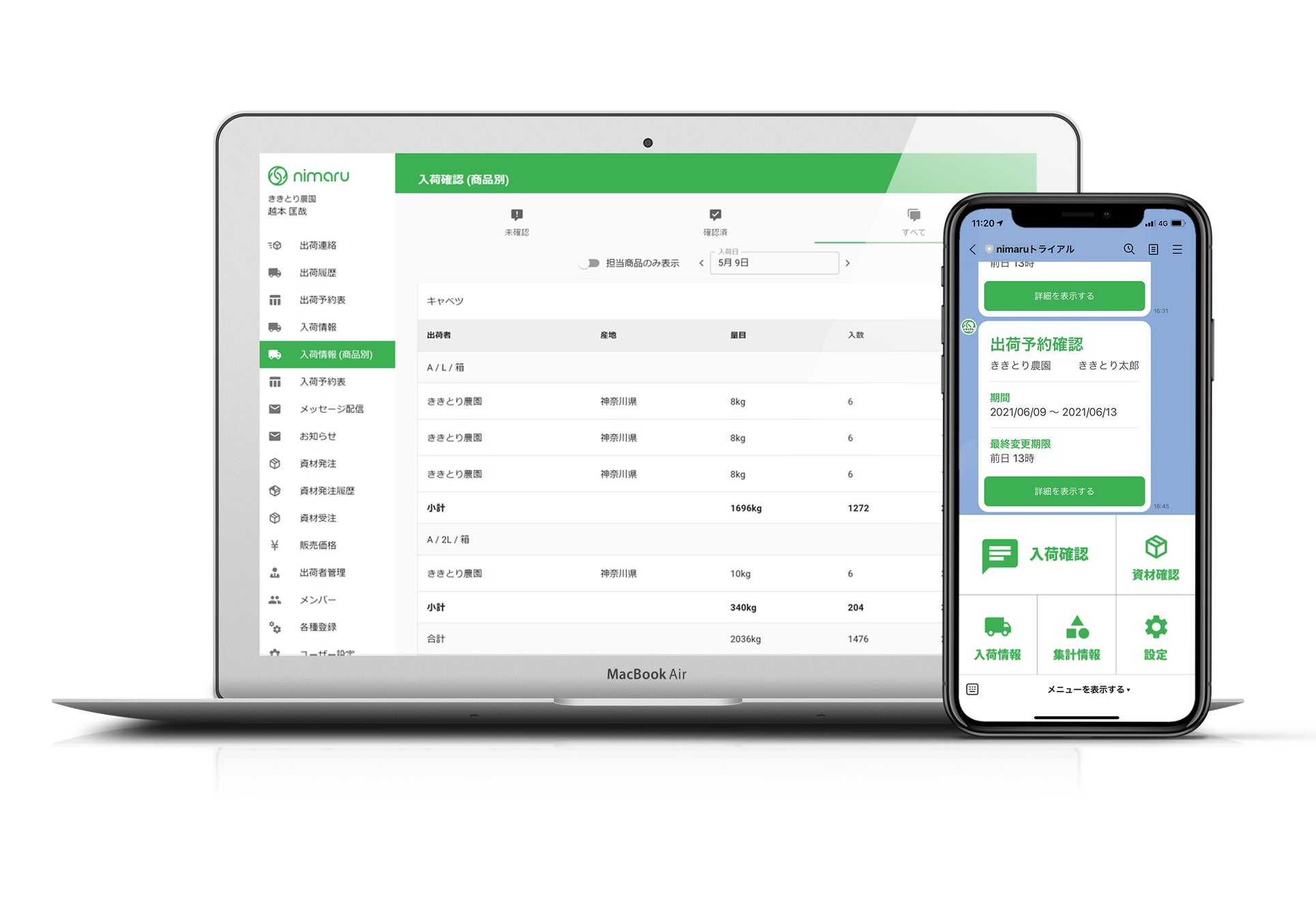 上記の課題を解決すべく、当社は2019年10月より農業流通現場向けクラウド型プラットフォーム『nimaru』のサービス提供を開始。初期のターゲットとして農産物流通の中でも3兆円の市場規模を持つ青果流通(野菜・果物の流通)に焦点をあて、青果物という複雑な商品を扱う流通現場の様々な業務を全国の流通現場に実際に入りながら地道にシステムのモデリングを行ってきました。その結果、業界でもほとんど例がない、外部事業者とのデータ連携が可能なクラウド型の汎用的サービスとして、JAや卸売市場を中心に全国の青果流通事業者及び生産者に利用されています。