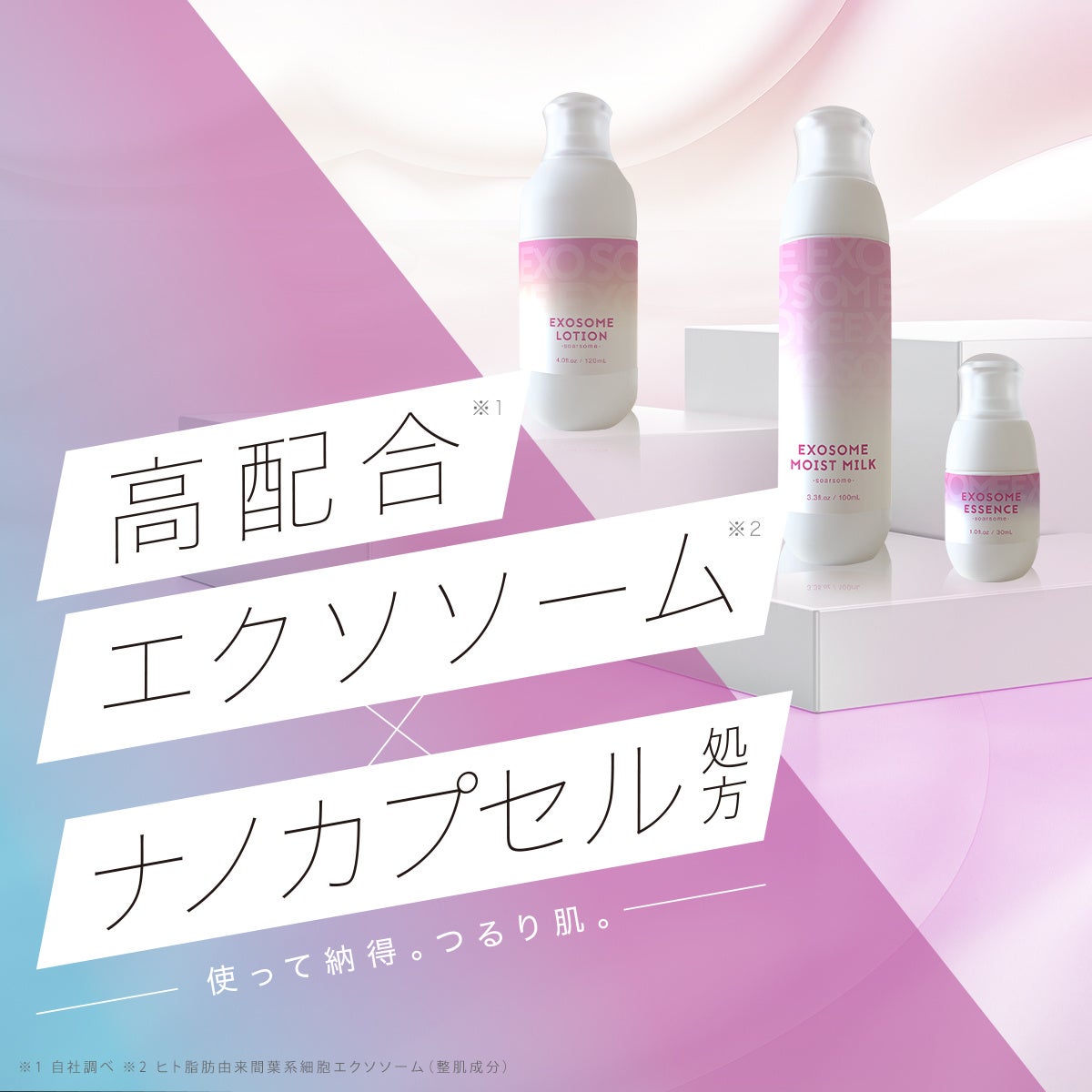 「soarsome」は、長年実績を築き上げた原料メーカーとの連携により、品質を重視しながらコストを抑え、より多くの皆様に愛される商品として発売しております。「本当にこの値段でエクソソーム*¹の化粧品が・・・」と驚きの声が我々に多く届いています。「soarsome」は、化粧水・美容液・乳液の3ステップのスキンケアラインにおいて、全てのアイテムでエクソソーム*¹の配合量が成分中最多となっています。エクソソーム*¹とは、ヒト幹細胞培養液にも含まれている貴重な成分であり、細胞が放出する微小な胞体の一つとして、細胞間の情報伝達の役割を果たしています。「soarsome」では、このエクソソーム*¹が高配合*²されることにより細胞間のコミュニケーションが盛んに行われ、肌のハリや弾力などへの効果が期待できます。