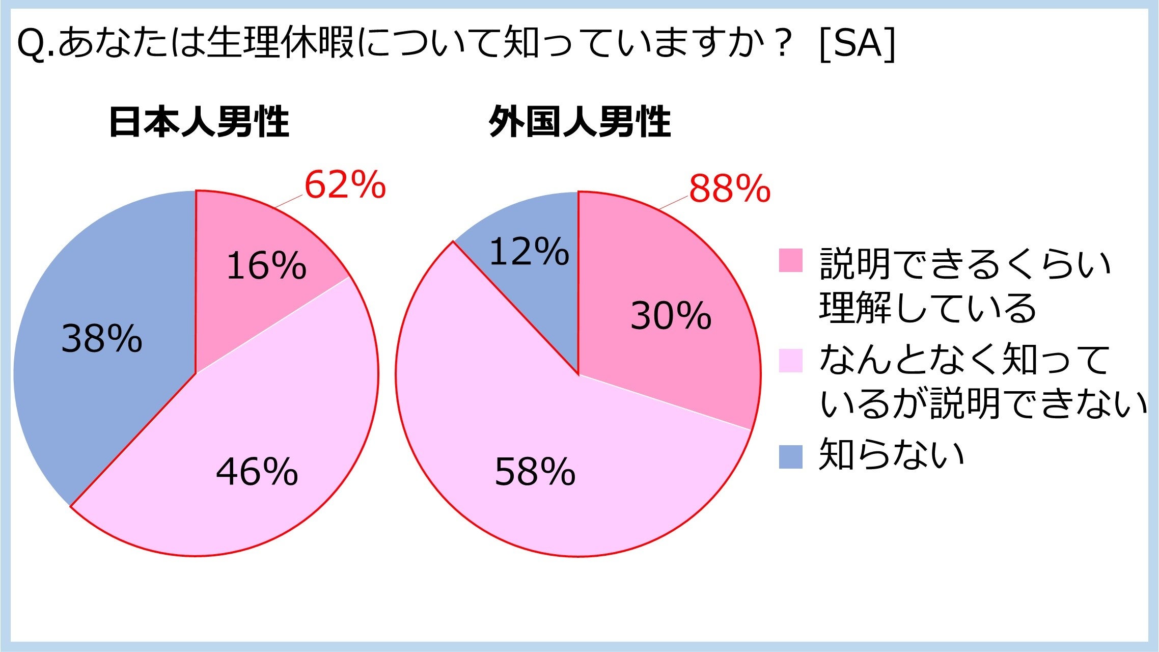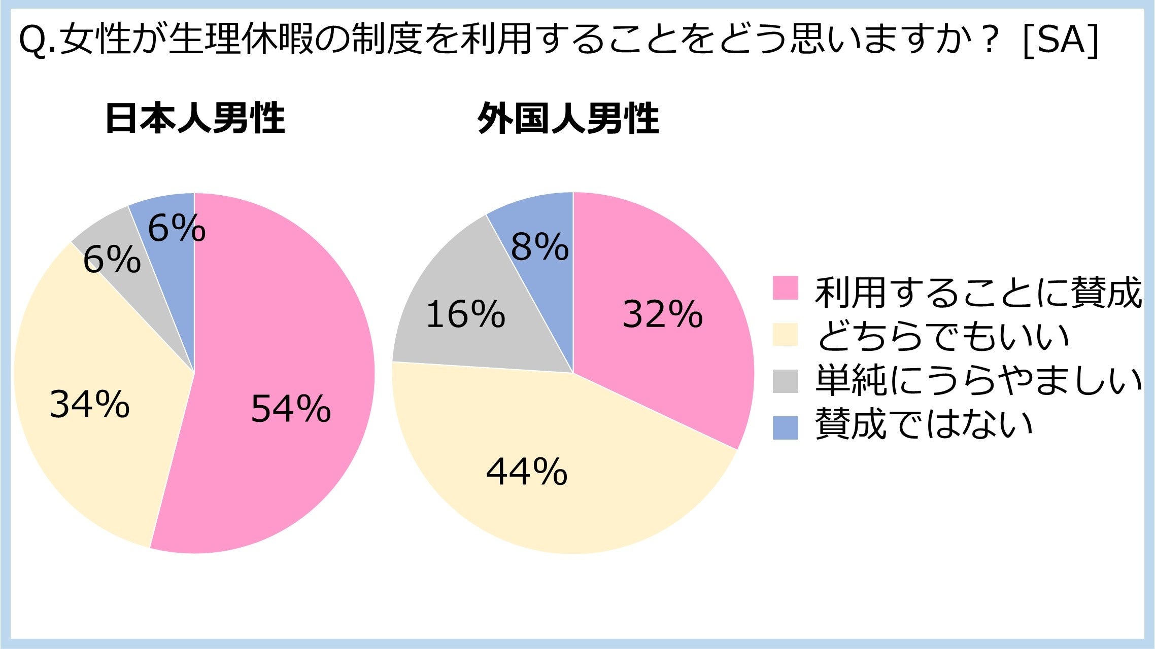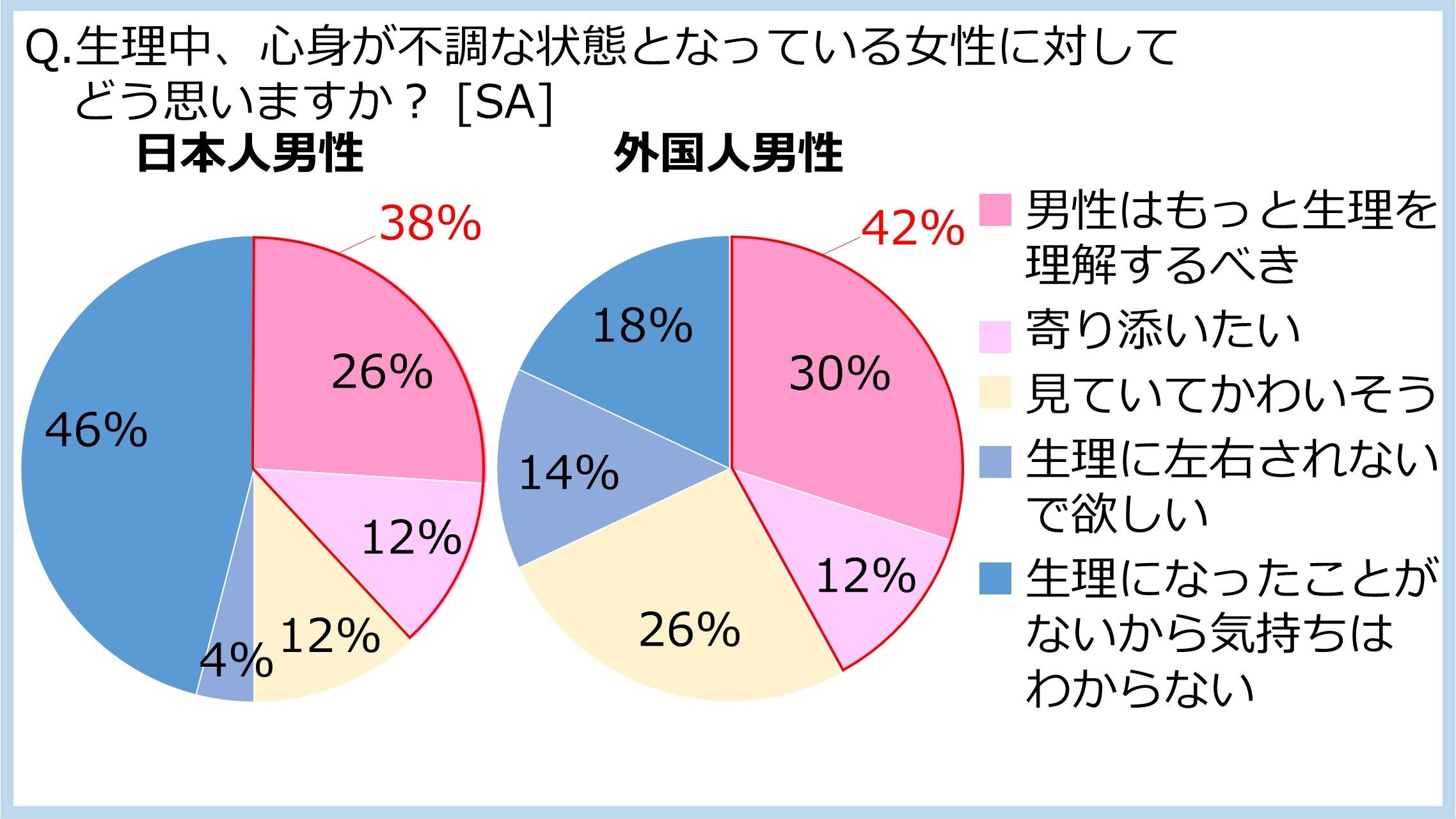 女性の2人に1人が生理による体調不良で仕事や生活に影響が出ていることが分かり、そんな女性に対して、「男性はもっと生理を理解するべき」「寄り添いたい」と思っている日本人男性が38%、外国人男性は42%を占めました。一方で、日本人男性の46%が「生理になったことがないから、気持ちはわからない」と回答し、外国人男性の18%という結果に比べて高い割合となりました。
