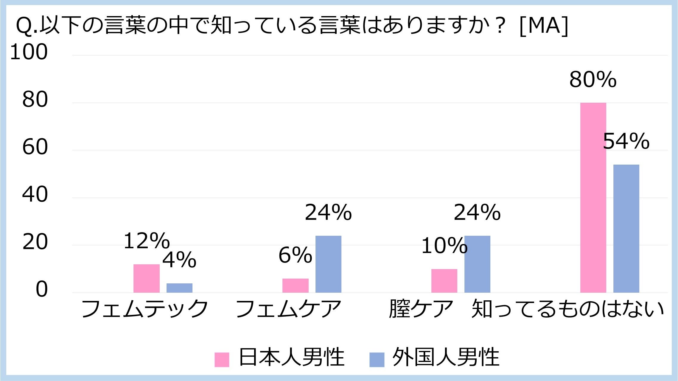 - 日本人男性と外国人男性の「フェムテック・フェムケア・膣ケア」への認知度