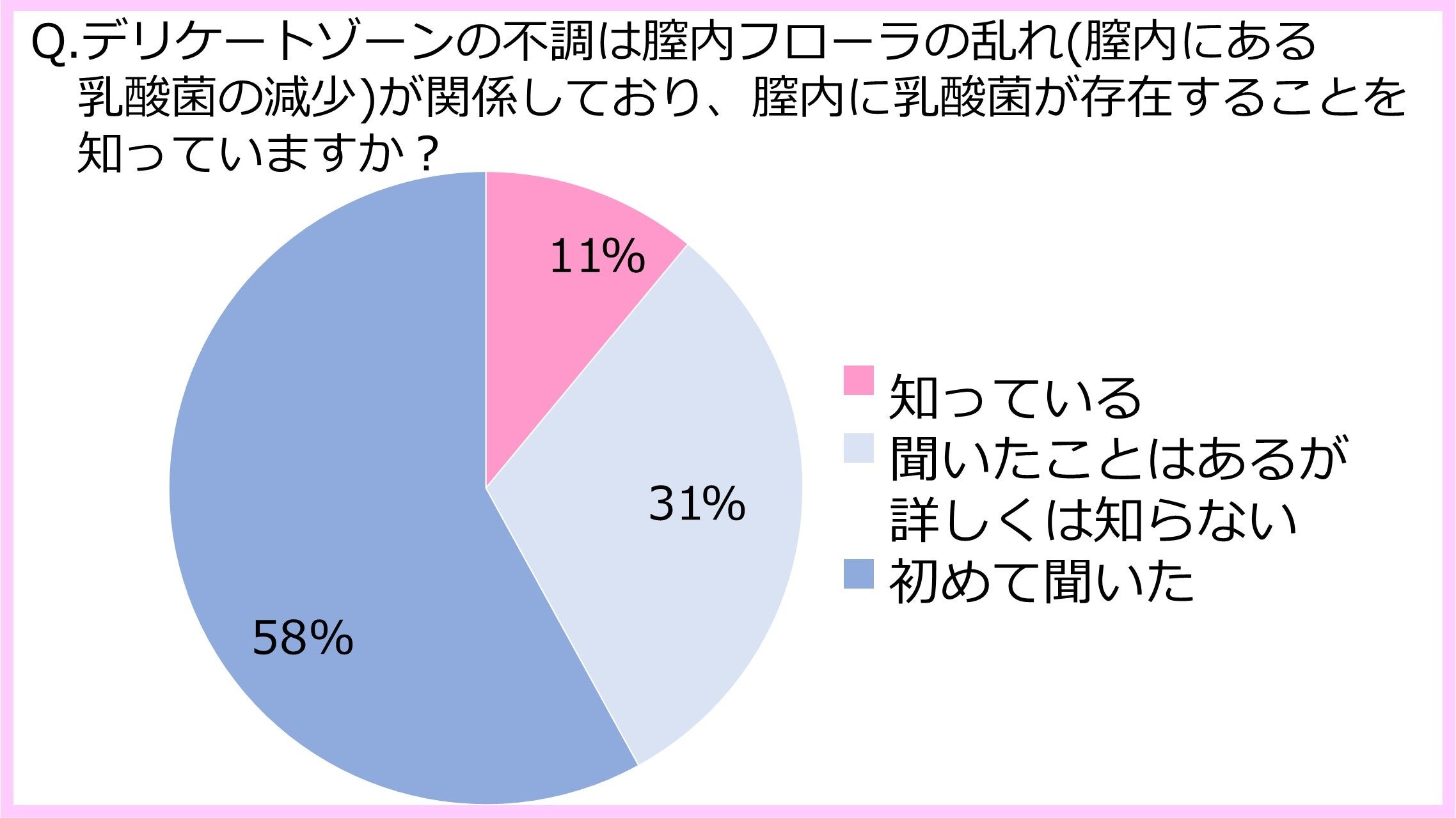 また、デリケートゾーンの不調は膣内フローラの乱れ(膣内にある乳酸菌の減少)が関係していることについて、膣内に乳酸菌が存在することを知っている女性は11%でした。