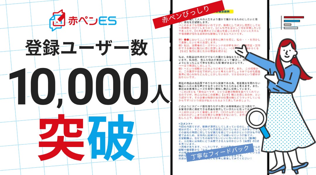 エントリーシート(ES)添削サービス「赤ペンES」(https://akapen-es.com/)は、サービス開始から9か月で、登録ユーザ数が1万人を突破したことをお知らせいたします。