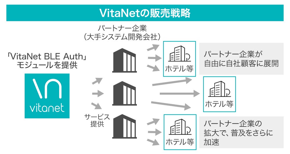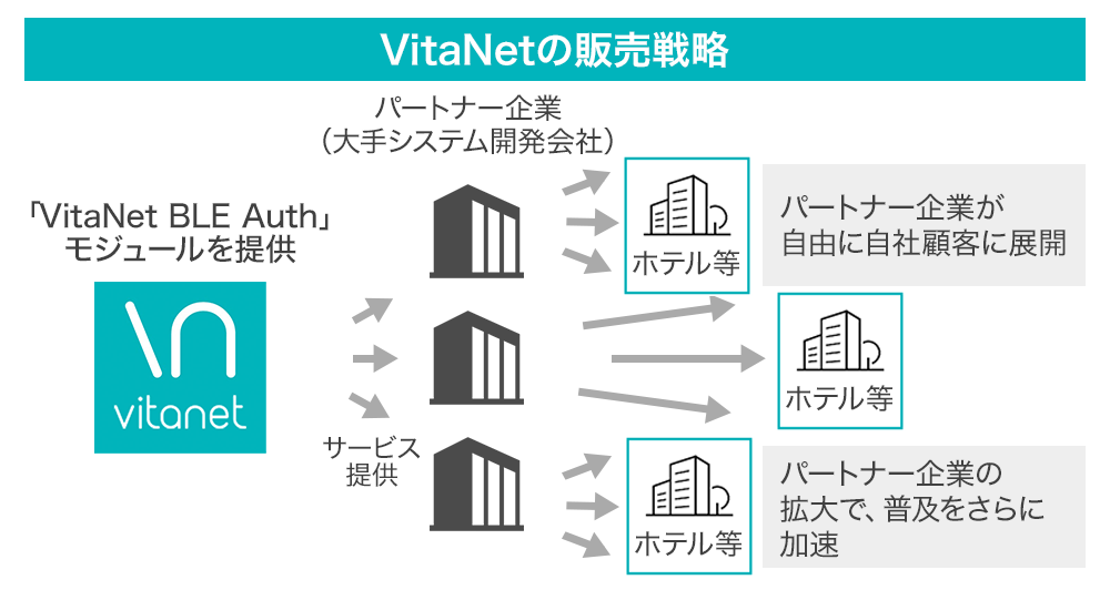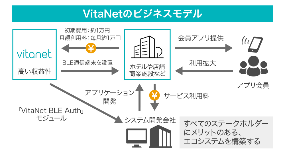 自社特許技術に加えて、会員アプリを持つ事業会社、パートナー、利用者の各々に明確なメリットのあるビジネスモデルも、他のサービスを寄せ付けないVitaNet BLE Authの優位性となります。
