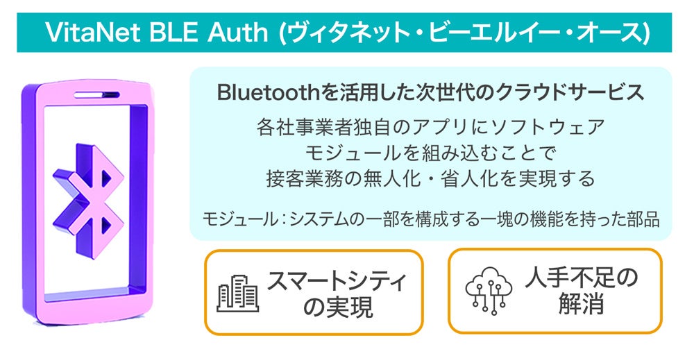 ヴィタネット・ジャパン株式会社が提供する「VitaNet BLE Auth(ヴィタネット・ビーエルイー・オース)」は、モノ、サービス、入場券などの予約や支払いをしたネット上の本人IDと、実在する本人との関係を証明する、新世代の高度認証のニーズに応える本人認証サービスです。