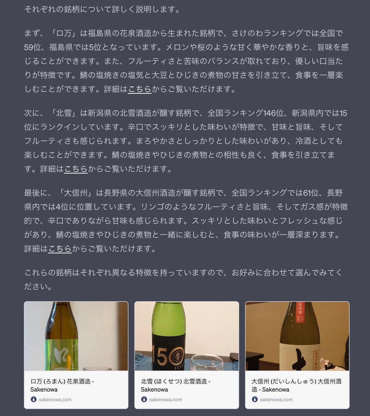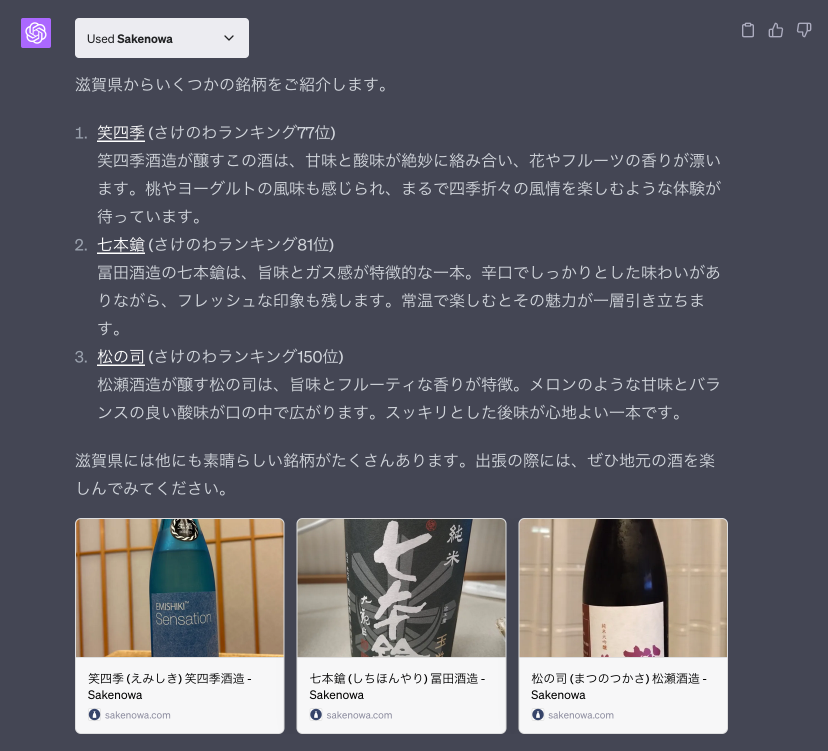 日本酒アプリさけのわは、ChatGPTプラグインをリリースしました。AIとの会話を通じて以下のことができます。