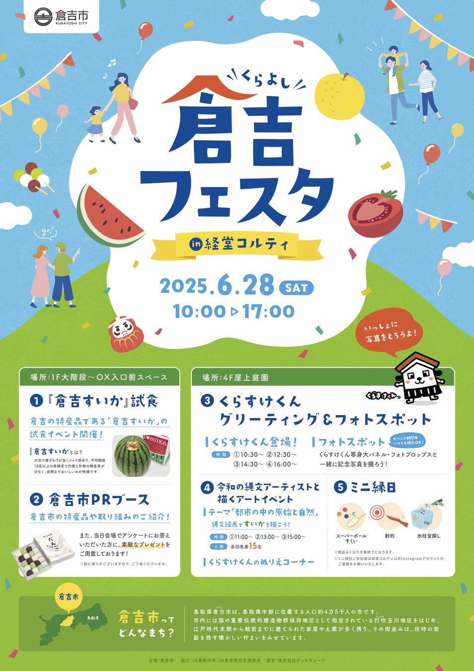 鳥取県倉吉市(くらよしし)は、東京・世田谷区にある商業施設「経堂コルティ」にて、特産品や市内観光などの魅力を紹介するイベント「倉吉フェスタ in 経堂コルティ」を2025年6月28日(土)に開催いたします。
