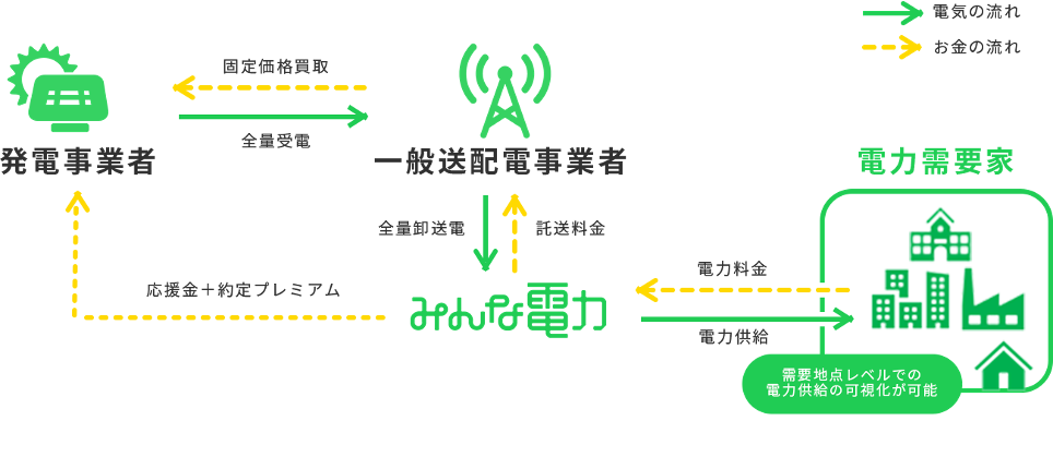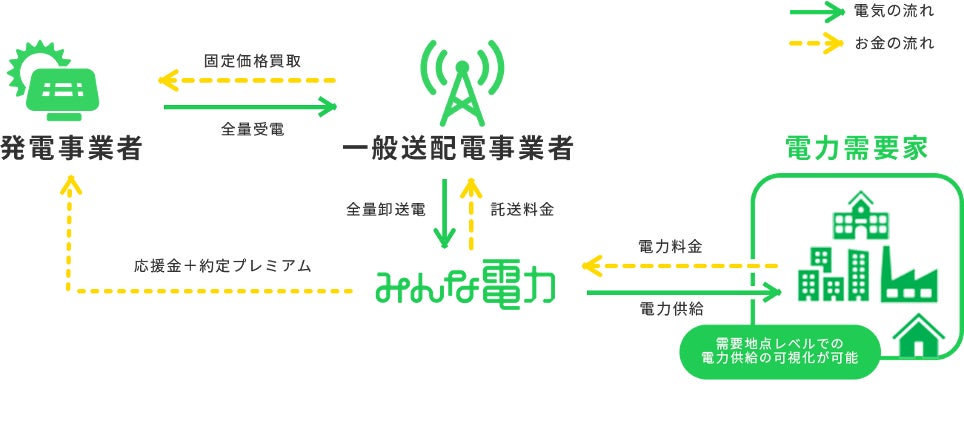 当社は、京都府(2件)・岐阜県・兵庫県に保有する太陽光発電所からの再生可能エネルギーを、みんな電力を介して環境負荷の少ないエネルギーの導入を目指す個人・法人の一般需要家へ電力供給することで、脱炭素化社会の推進と再生可能エネルギーの普及を目指します。