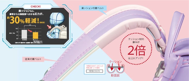 肩ベルトのクッション材の厚みを従来品と比べて2倍以上にアップしました。
