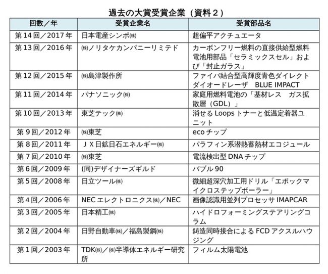 第15回/2018年 超モノづくり部品大賞 受賞企業一覧(資料1)
