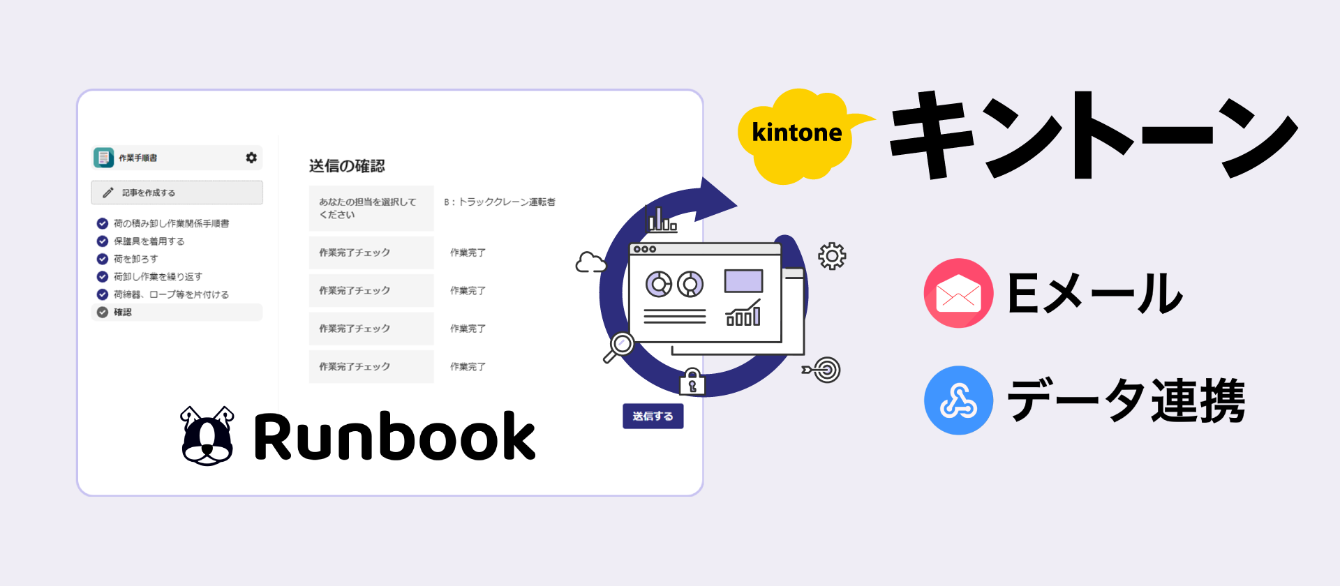 Runbookは一方向で読ませるだけのマニュアル作成サービスではありません。フォーム機能を使えば、ユーザーからの書類提出や報告書の作成、アンケート収集など、さまざまなデータを集めることも可能です。点検の各ステップごとにメールを送信したり、サイボウズ社のkintone(キントーン)と連携して、作業の進捗状況をkintoneに送信するなどといった、さまざまなデータ連携が可能となります。