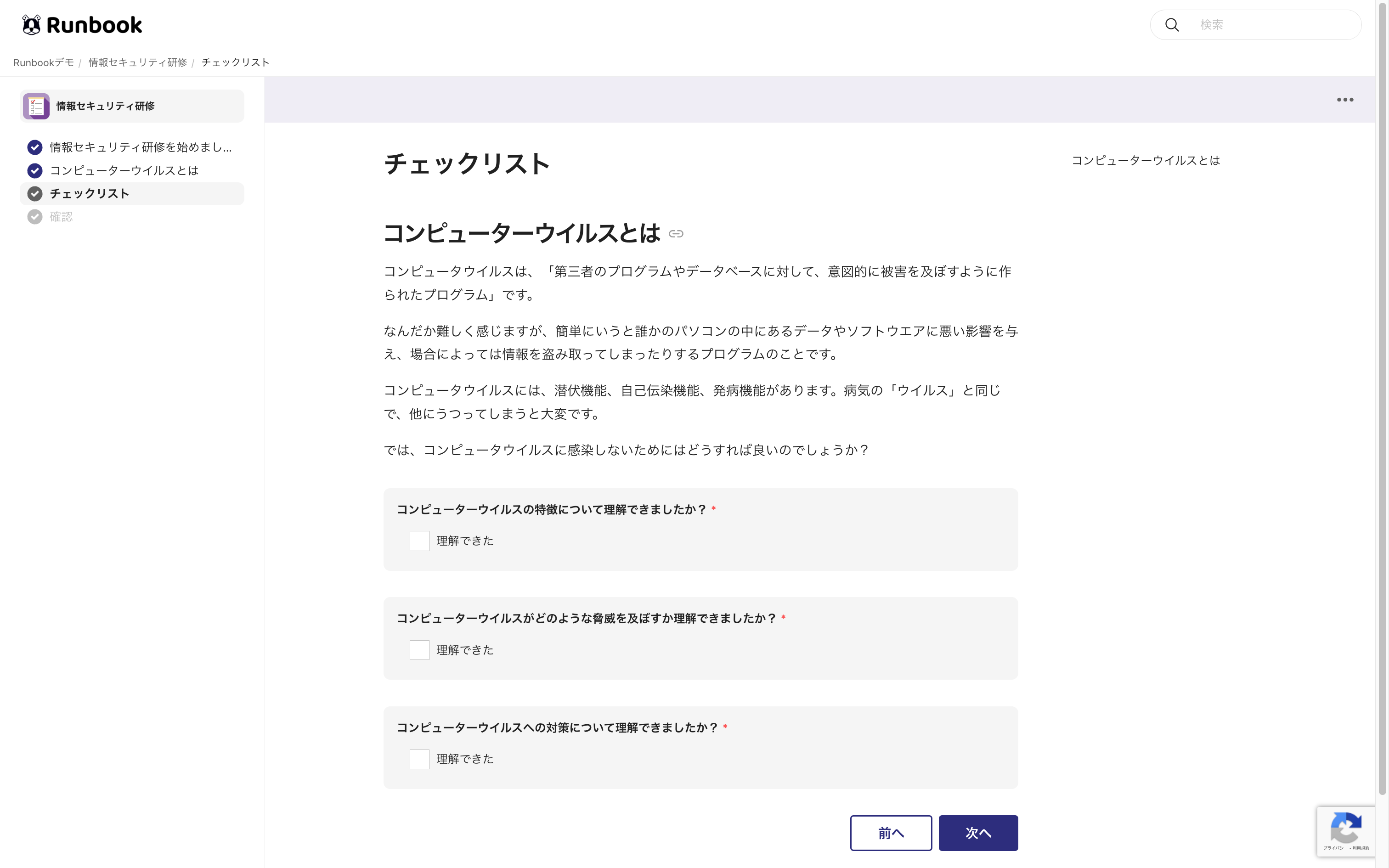 Runbookの特徴のひとつである「条件分岐」機能を使えば、ユーザーが選択した内容によって、表示される文書を変化させることができます。たとえば新入社員用向けのマニュアルを作る際も、所属する部署や業務内容によって確認するべきマニュアルを自動的に分岐させることができます。