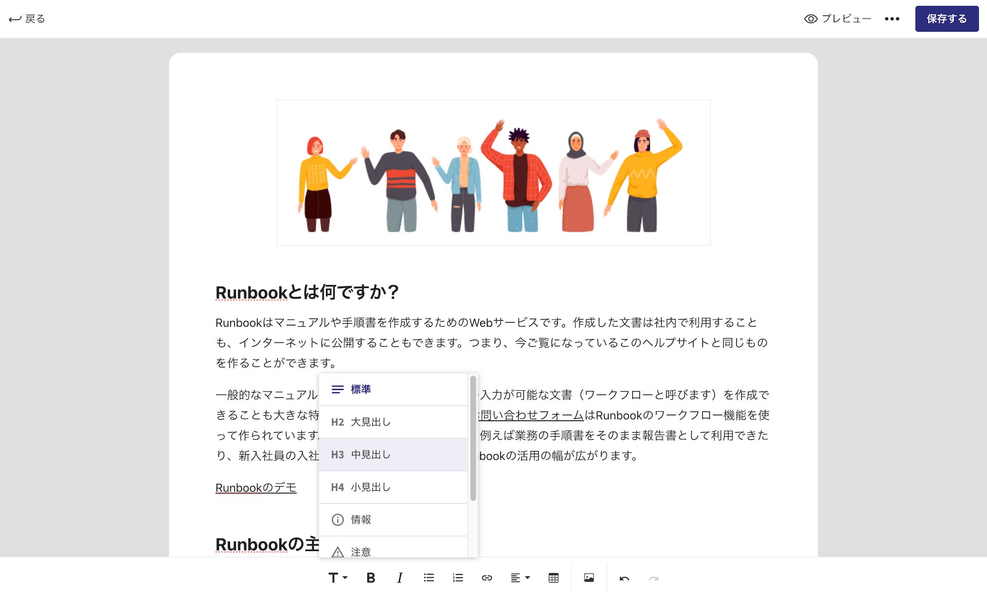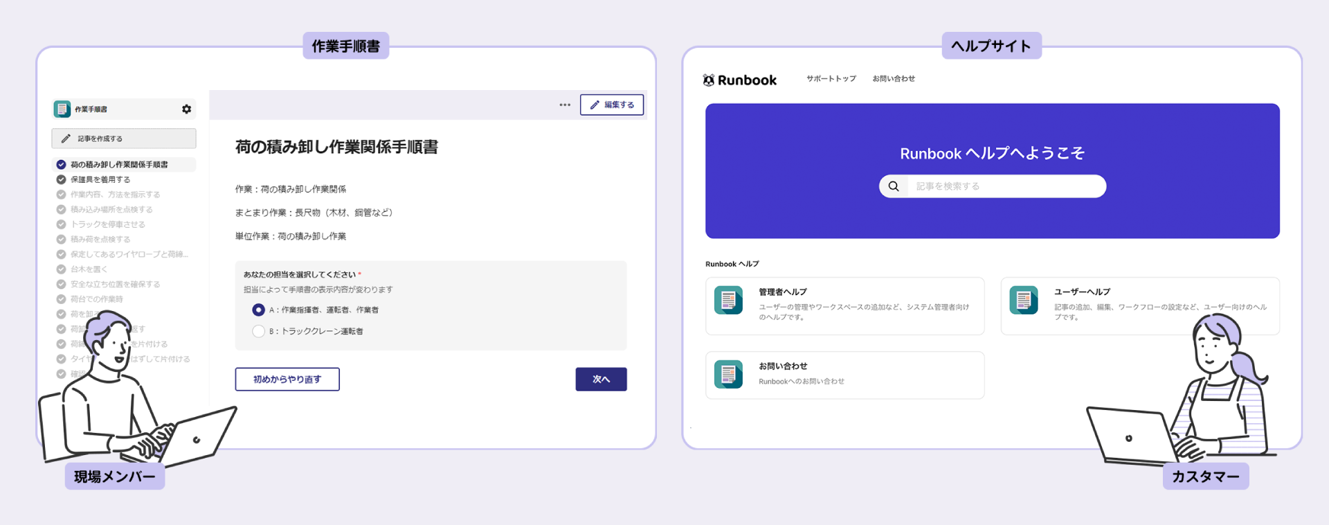 Runbookで作った文書は、社内のマニュアルや手順書だけでなく、社外向けのウェブサイトとしてインターネットに公開することができます。独自ドメインの利用や、デザインのカスタマイズも可能なため、自社サービス専用のヘルプサイトやマニュアルサイトとしてご利用いただけます。