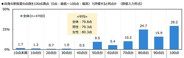 - 自身の家族愛を100点満点で評価 全体平均は79.8点、男性平均は79.3点、女性平均は80.3点