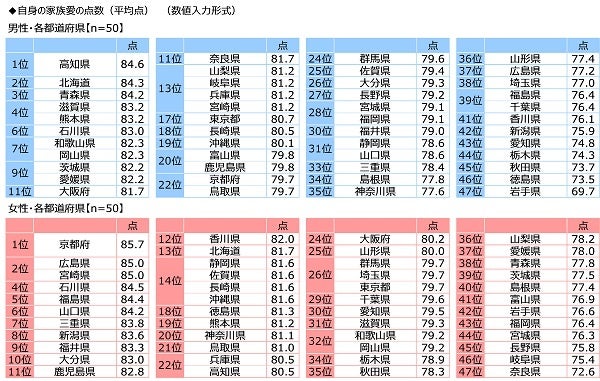 ジブラルタ生命調べ 自身の家族愛を100点満点で評価 全体平均は79.8点、自己評価が高い都道府県 男性1位「高知県」、女性1位「京都府」