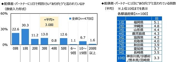 都道府県別にみると、配偶者・パートナーから1日に“ありがとう”と言われている回数の平均は、福岡県(5.1回)が最も多くなり、沖縄県(4.8回)、山形県(4.4回)が続きました。