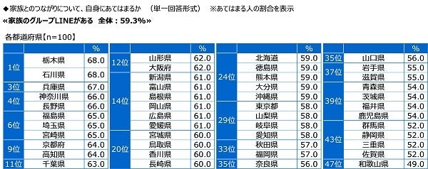 - 「家族のグループLINEがある」全体の59%、都道府県別の1位は栃木県と石川県