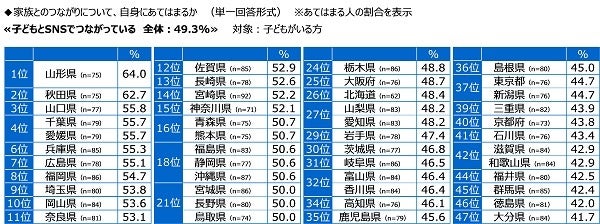 - 「子どもとSNSでつながっている」子どもがいる人の49%、都道府県別の1位は山形県
