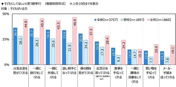 - 子どもにしてほしい親孝行 1位「元気な姿を見せてくれる」2位「一緒に旅行をしてくれる」3位「一緒に外食してくれる」