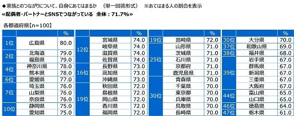 - 「配偶者・パートナーとSNSでつながっている」全体の72%、都道府県別の1位は広島県