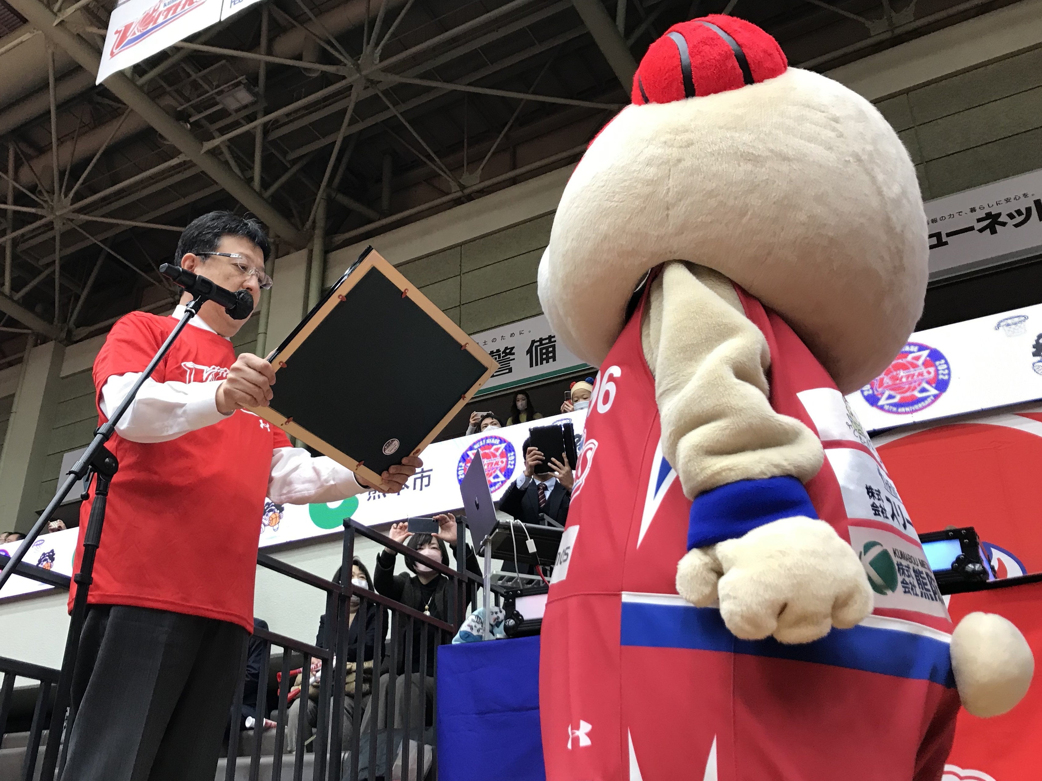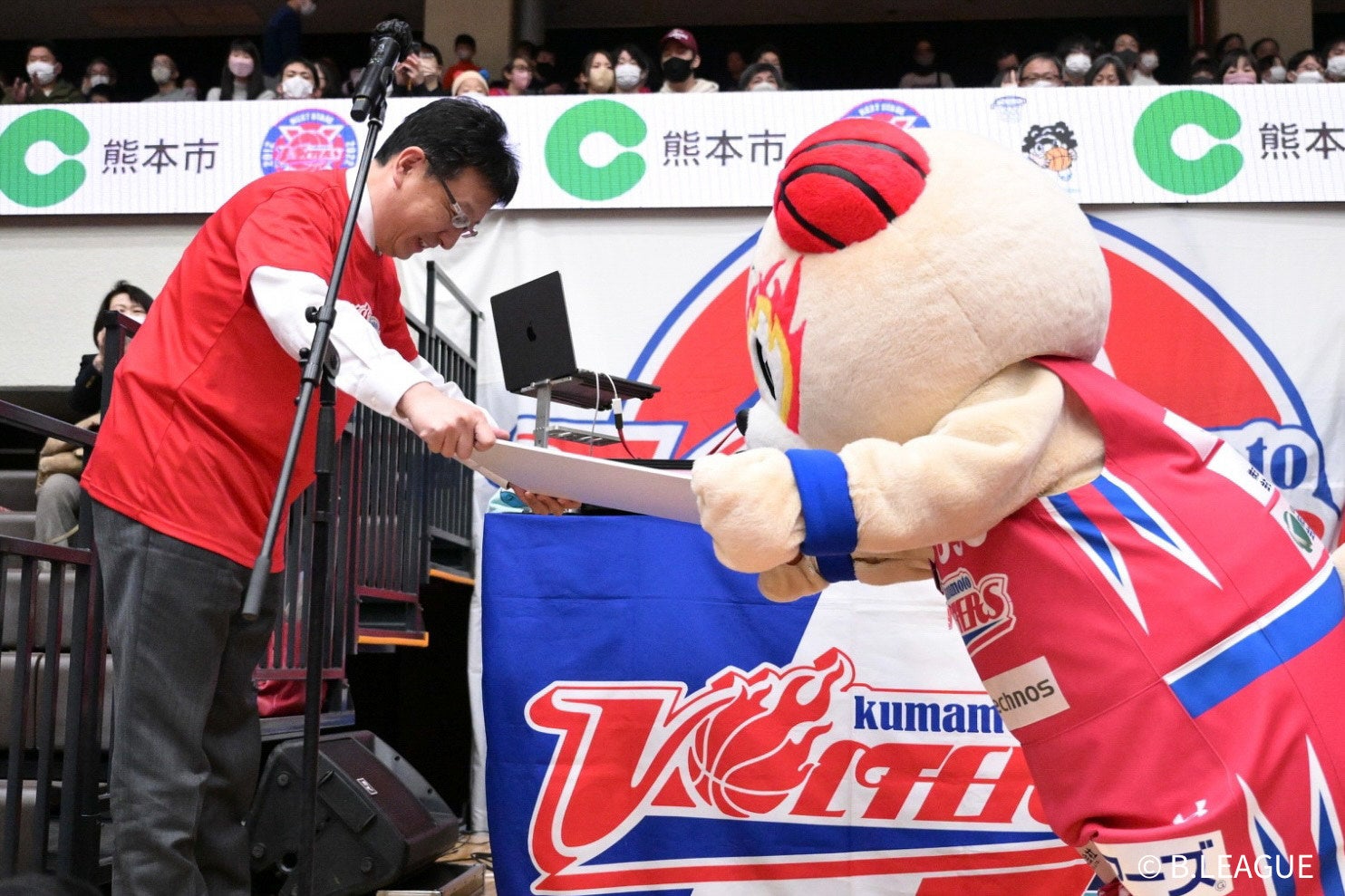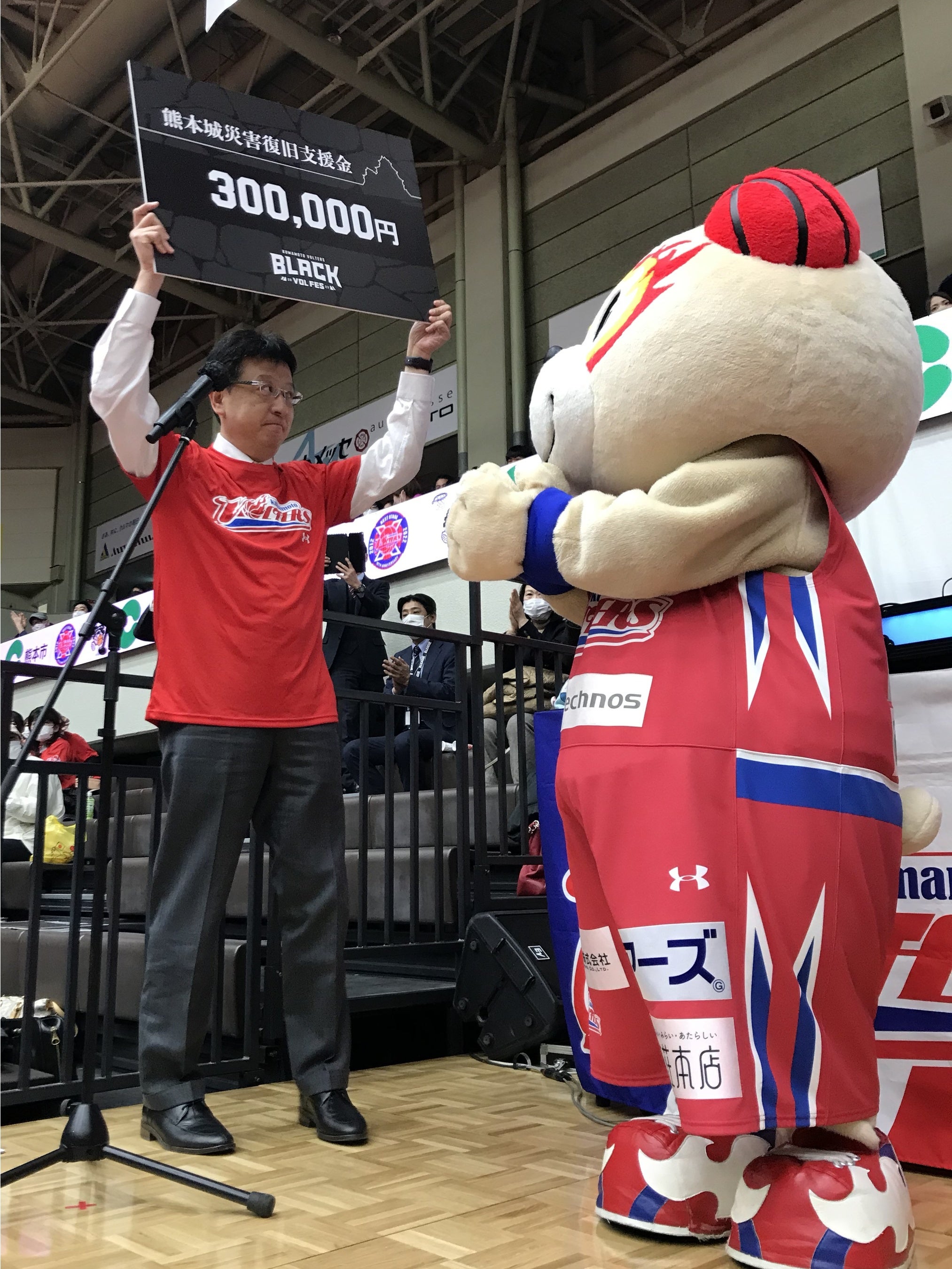 2023年2月5日(日)に熊本県立総合体育館で行われた熊本市の冠ゲームの試合前に贈呈式を執り行い、熊本市の大西一史市長に目録をお渡ししました。大西市長からは、熊本ヴォルターズに対して感謝状をいただき、ご来場いただいた皆様にご報告しました。