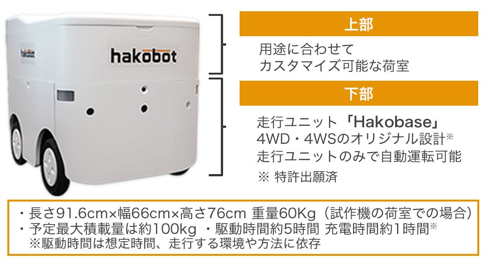 Hakobotの配送ロボットは、ロボット下部の走行ユニット「Hakobase(ハコベース、以下:Hakobase)」に荷室部を合わせたものになります。弊社は、配送ロボットの日本での公道実用化の早期実現に向けた開発を続けており、走破性と堅牢性に優れた設計の4WD(四輪駆動)と、内輪差を限りなく減少させた独自の4WS(四輪操舵)を採用することで、日本特有の多様な路面状況や限られた空間でもスムーズかつ安全に走行できる仕様を実現しました。また、走行ユニットに取り付ける荷室部はカスタマイズ可能な設計になっています。