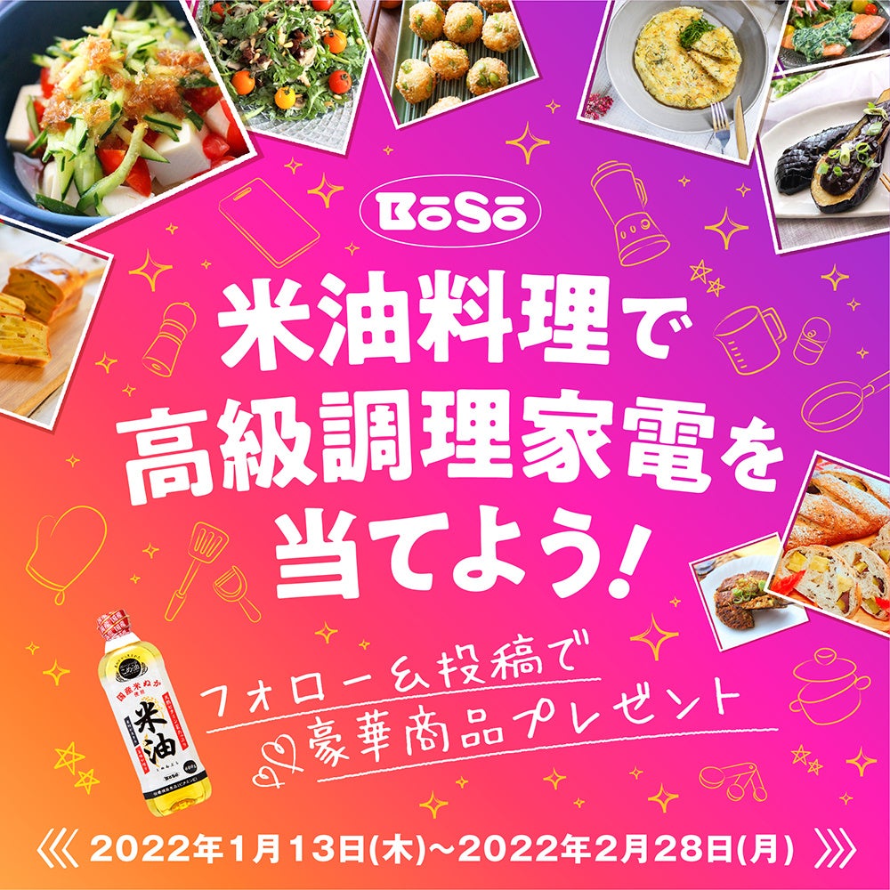 ボーソー油脂株式会社(本社:東京都中央区、代表取締役社長 川崎薫)は、ボーソー公式インスタグラムの公開を記念して、当公式インスタグラムアカウントにて「フォロー&投稿で豪華賞品プレゼントキャンペーン」を実施いたします。本キャンペーンを通じて、米油を使ったことのない方には米油の良さを知ってもらう機会に、使ったことのある方には更なる発見の機会になればうれしいです。