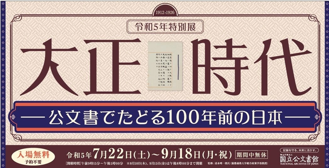 独立行政法人国立公文書館(所在地:東京都千代田区、館長:鎌田 薫)は、令和5年7月22日(土)から9月18日(月・祝)まで令和5年特別展「大正時代 ― 公文書でたどる100年前の日本 ―」を開催しております。